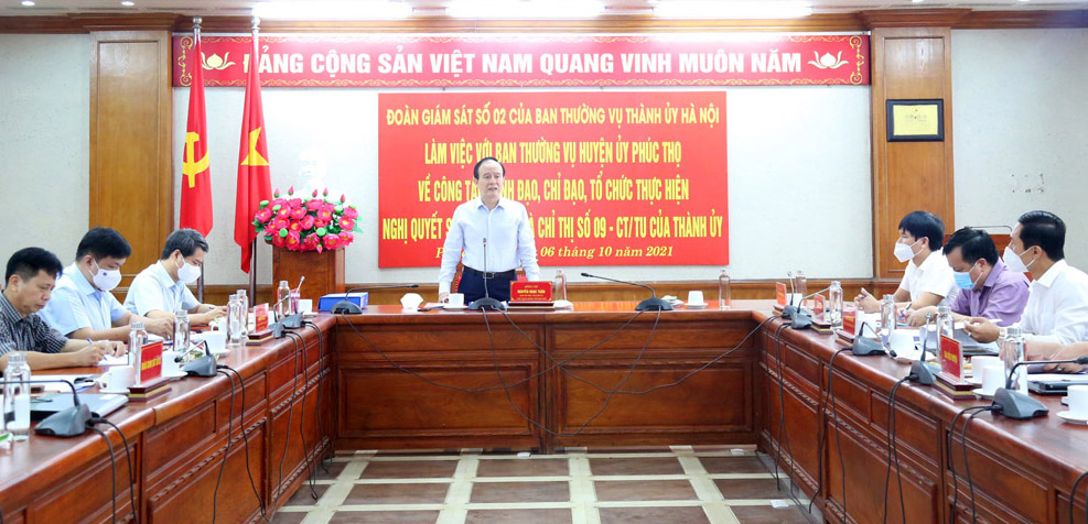 Ngày 6/10, Đoàn giám sát số 2 của Ban Thường vụ Thành ủy Hà Nội do Phó Bí thư Thành ủy, Chủ tịch HĐND thành phố (TP) Hà Nội Nguyễn Ngọc Tuấn làm Trưởng đoàn đã làm việc với Ban Thường vụ Huyện ủy Phúc Thọ về công tác lãnh đạo, chỉ đạo và tổ chức thực hiện Nghị quyết số 08-NQ/TU, ngày 15/9/2016 của Ban Thường vụ Thành ủy về “Nâng cao hiệu lực, hiệu quả công tác bồi thường, hỗ trợ, tái định cư khi Nhà nước thu hồi đất trên địa bàn thành phố Hà Nội giai đoạn 2016-2020 và những năm tiếp theo”; Chỉ thị số 09-CT/TU, ngày 1/9/2016 của Ban Thường vụ Thành ủy về “Tăng cường sự lãnh đạo của các cấp ủy Đảng đối với công tác cấp giấy chứng nhận quyền sử dụng đất, quyền sở hữu tài sản gắn liền với đất trên địa bàn thành phố Hà Nội”.