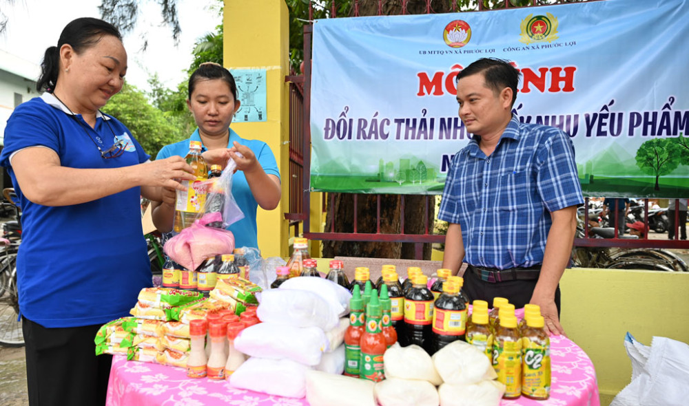 UBMTTQ Việt Nam xã Phước Lợi, huyện Bến Lức phối hợp Công an xã triển khai mô hình Đổi rác thải nhựa lấy nhu yếu phẩm