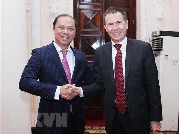 Thứ trưởng Bộ Ngoại giao Việt Nam Nguyễn Quốc Dũng đón Thứ trưởng Bộ Ngoại giao và Thương mại Australia Richard Maude. (Ảnh: Lâm Khánh/TTXVN)