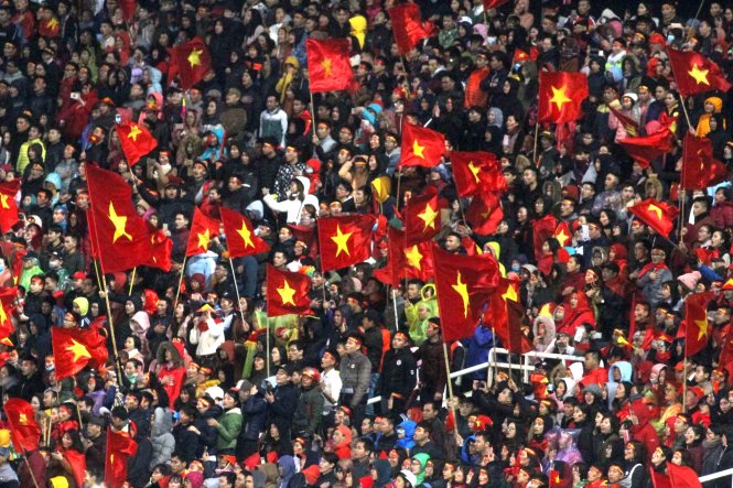 Người hâm mộ ở Hà Nội chào mừng các thành viên đội tuyển U 23 VN trong lễ mừng công hôm 28/01 tại sân Mỹ Đình. Ảnh: N.Khôi