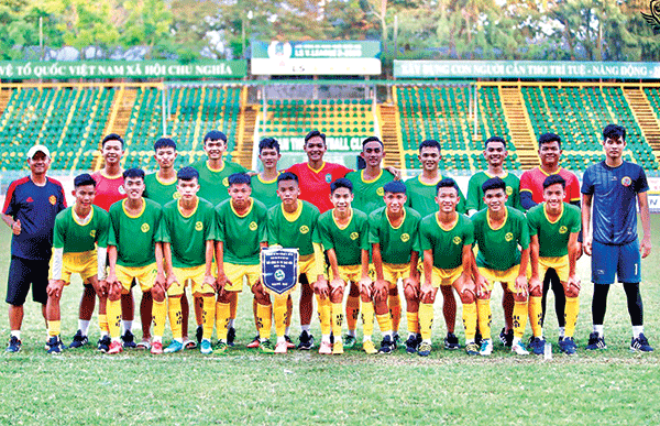HLV Nguyễn Chí Thiện (bìa trái) và tập thể đội U19 Cần Thơ.