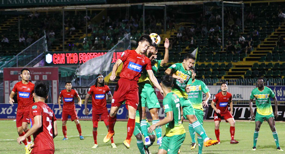Các cầu thủ Cần Thơ (phải) nỗ lực ngăn cản cầu thủ Hải Phòng (trái) trong trận đấu chiều 28-9.