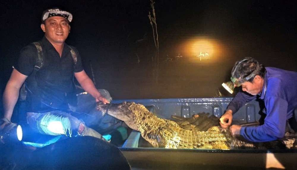 Khi kéo lên, anh Chuyển phát hiện 1 một con cá sấu lớn có trọng lượng khoảng 37kg. Sau khi bắt cá sấu, anh Chuyển chủ động liên hệ và mang cá thể cá sấu đến giao nộp cho Đồn Biên phòng Sông Trăng.