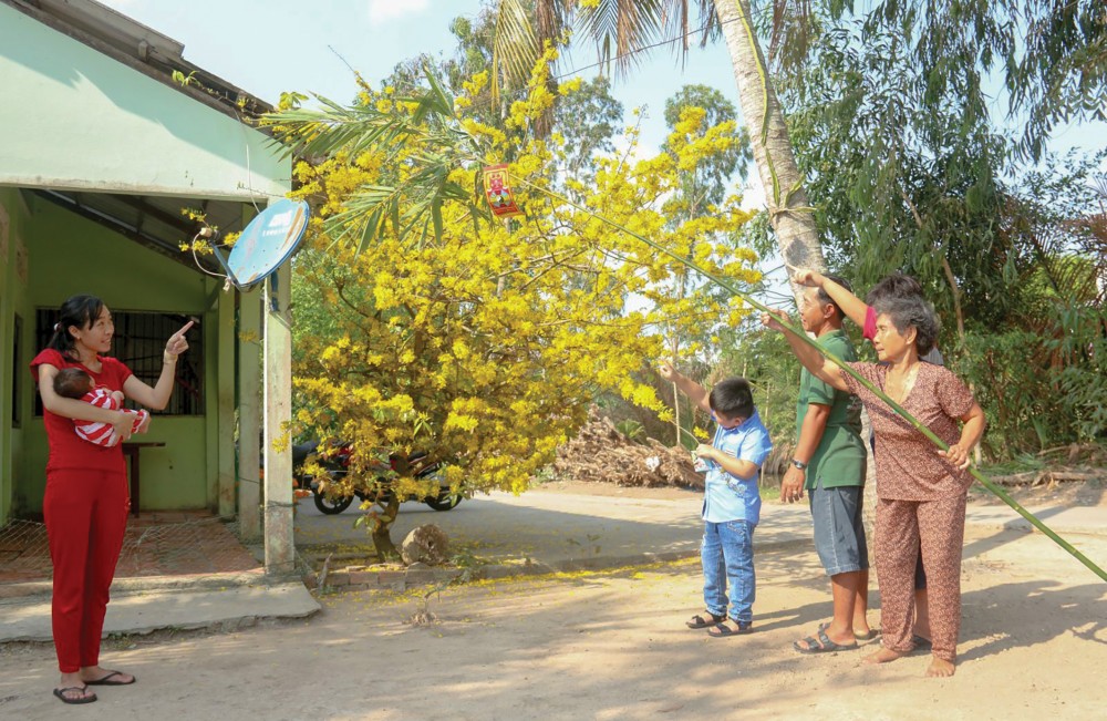 Nhiều cặp đôi chọn về quê đón Tết, sum họp bên gia đình nội ngoại. Trong ảnh: Gia đình dựng nêu ăn Tết. Ảnh: ĐĂNG HUỲNH