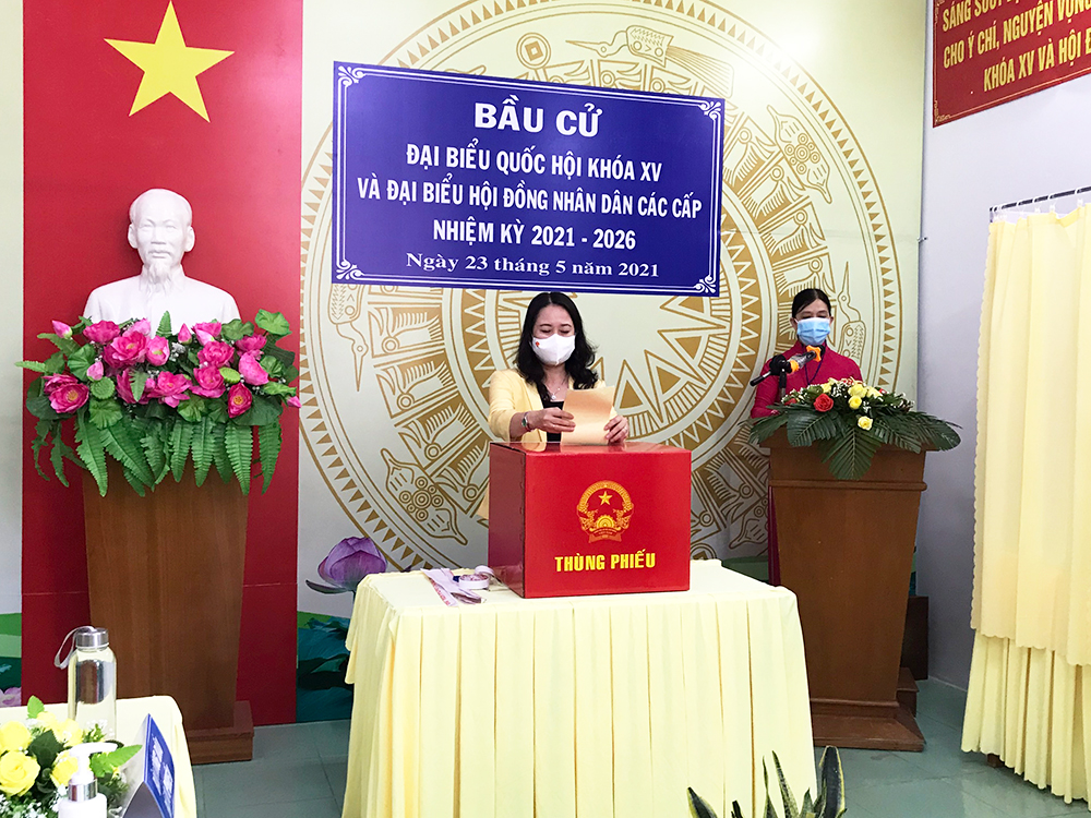 | Phó Chủ tịch nước Võ Thị Ánh Xuân bỏ phiếu tại TP Long Xuyên- An Giang. (Ảnh: Báo An Giang) |
