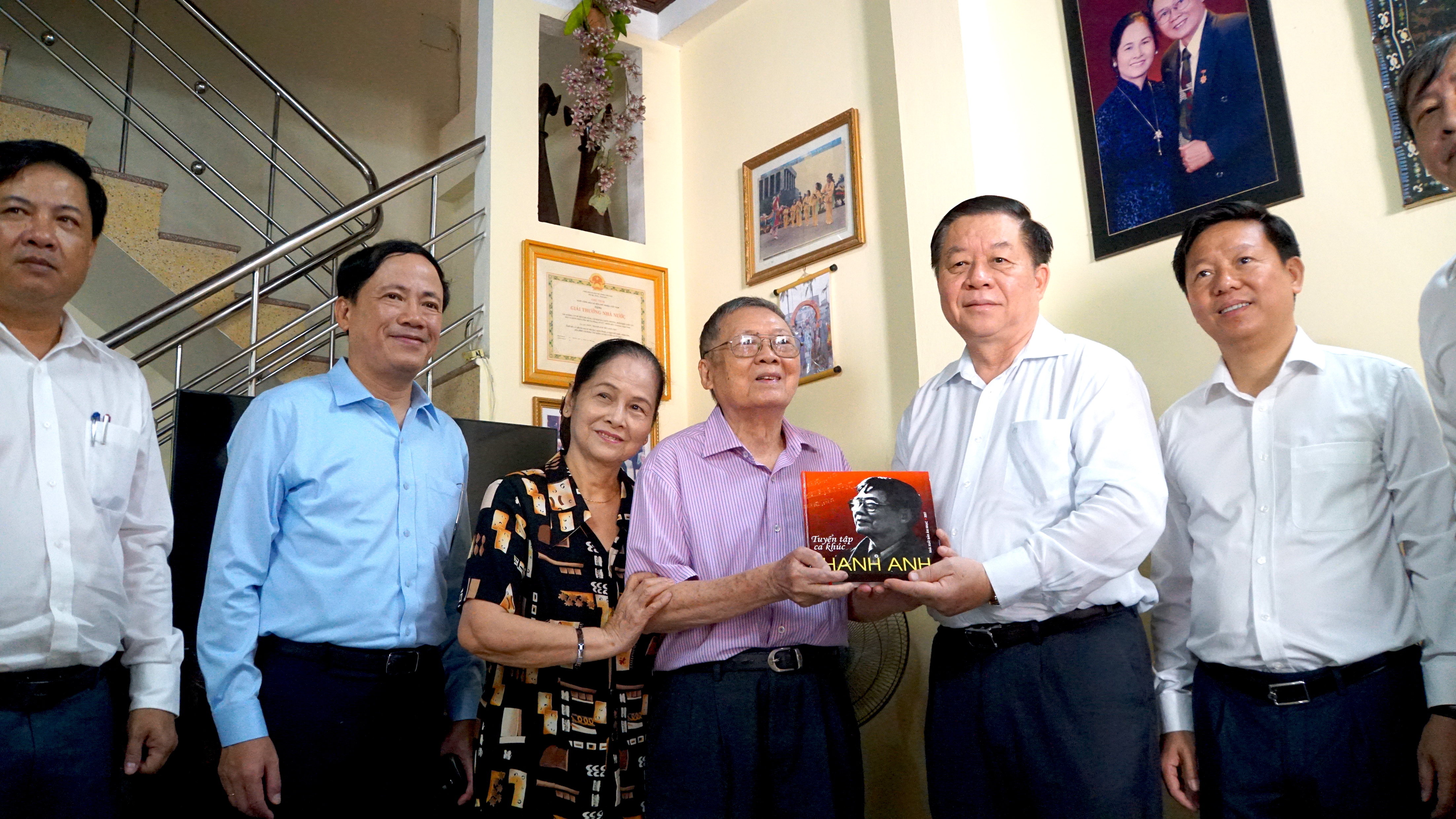 | Vợ chồng nhạc sĩ Thanh Anh trao tặng đồng chí Nguyễn Trọng Nghĩa tác phẩm của mình. |
