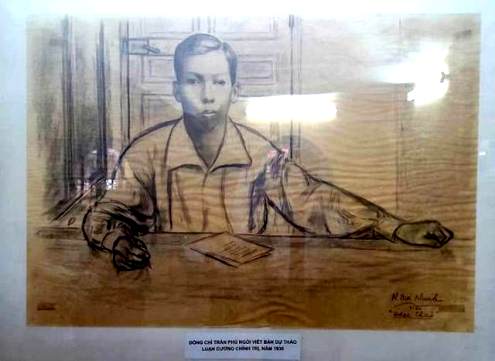 | Bức tranh phác thảo đồng chí Trần Phú ngồi soạn Luận cương chính trị 1930 được treo tại ngôi nhà 90 phố Thợ Nhuộm. |