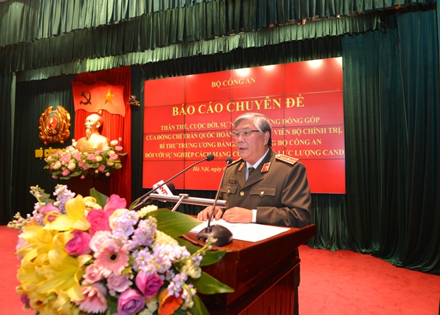 Tại hội nghị, Thiếu tướng, PGS, TS Nguyễn Bình Ban, nguyên Viện trưởng Viện Lịch sử Công an đã trực tiếp báo cáo chuyên đề về thân thế, cuộc đời, sự nghiệp, những đóng góp của đồng chí Trần Quốc Hoàn, nguyên Uỷ viên Bộ Chính trị, Bí thư Trung ương Đảng, Bộ trưởng Bộ Công an đối với sự nghiệp cách mạng của Đảng và lực lượng CAND.