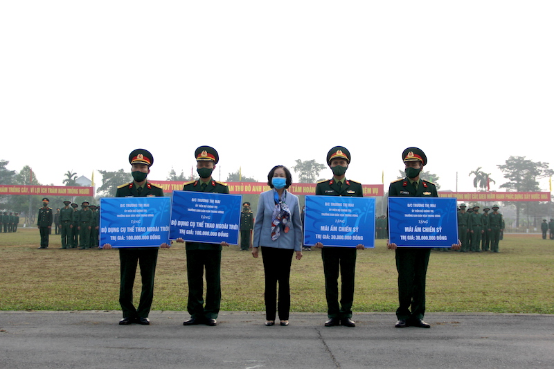 | Đồng chí Trương Thị Mai trao quà tặng cán bộ, chiến sỹ |