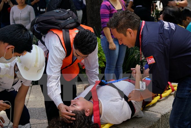 Lực lượng cứu hộ chuyển người bị thương sau trận động đất ở Mexico City ngày 19/9. (Nguồn: THX/TTXVN)