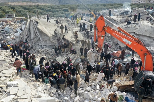 Lực lượng cứu hộ tìm kiếm nạn nhân trong đống đổ nát sau trận động đất tại Harim, tỉnh Idlib (Syria), giáp giới với Thổ Nhĩ Kỳ. (Ảnh: AFP/TTXVN)