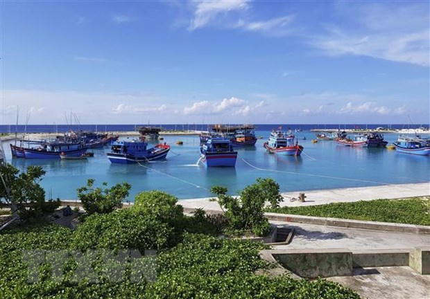 Tàu cá của ngư dân vào neo đậu tránh trú bão ở âu tàu Sinh Tồn, huyện đảo Trường Sa. (Ảnh: TTXVN phát)
