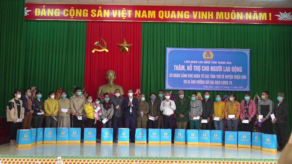 Cùng với đó, phát huy vai trò nòng cốt, nhằm hỗ trợ, chia sẻ khó khăn với những lao động có hoàn cảnh khó khăn trở về từ vùng dịch, Liên đoàn Lao động tỉnh Thanh Hóa đã thăm hỏi, trao tặng 80 suất quà cho người lao động tại các huyện: Thạch Thành, Hà Trung, Triệu Sơn, Hoằng Hóa với tổng trị giá 104 triệu đồng. Qua đó, động viên người lao động khắc phục khó khăn, sớm quay trở lại làm việc để ổn định cuộc sống cũng như góp phần cùng các địa phương, đơn vị phục hồi kinh tế do ảnh hưởng của dịch COVID-19.