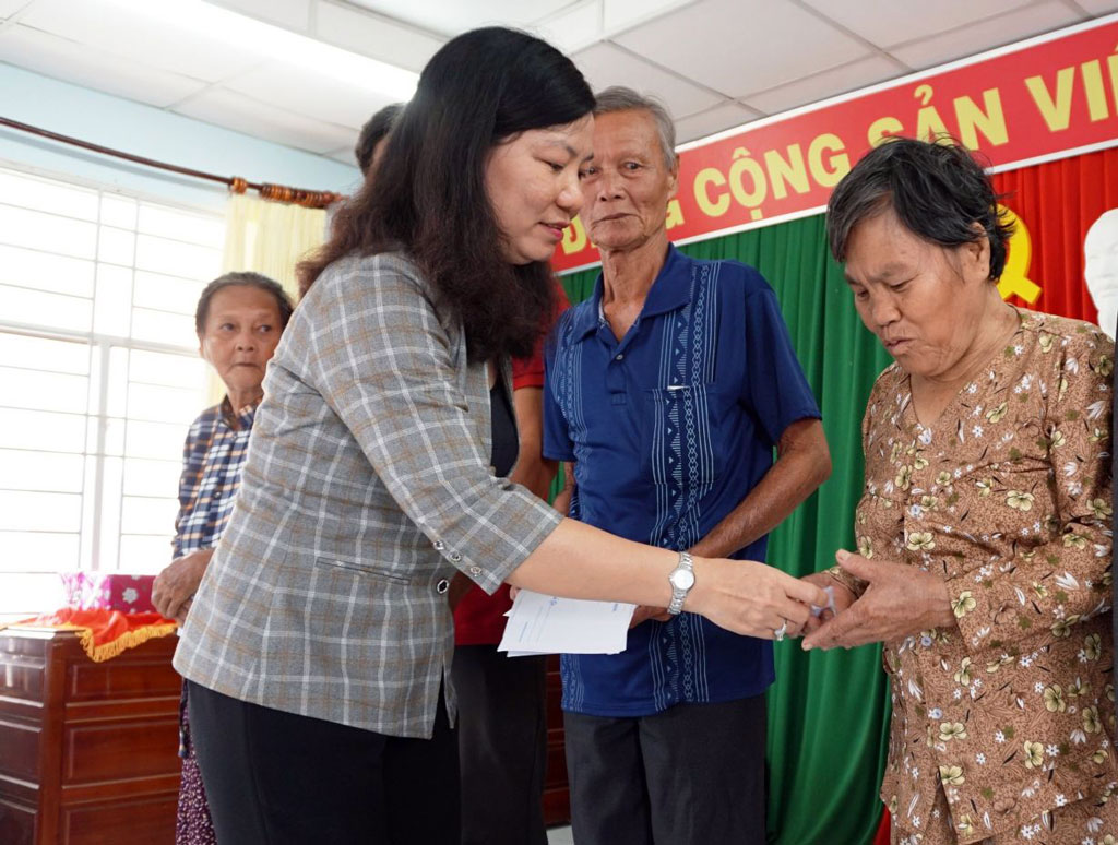 Chủ tịch Hội Liên hiệp Phụ nữ Việt Nam tỉnh Trà Vinh - Trần Thị Bích Phượng tặng quà cho phụ nữ nghèo