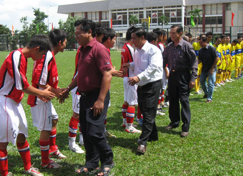 Phó Tổng Biên tập Báo Long An - Lê Hồng Thương (thứ 2 áo trắng) bắt tay các cầu thủ tham dự giải đấu Cúp bóng đá Báo Long An lần II năm 2010