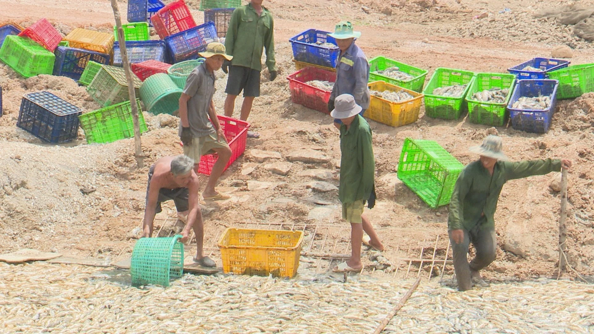 Các công nhân khẩn trương vớt cá lên bờ xuyên lễ. (Ảnh: LÊ LÂM)