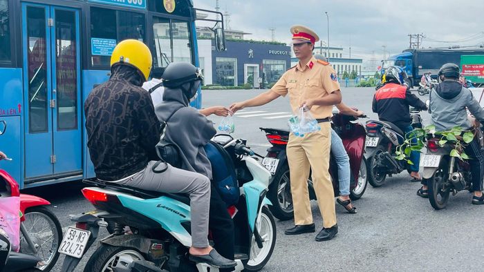| Cảnh sát giao thông, Công an tỉnh Đồng Nai phát nước và khăn lạnh cho người dân di chuyển qua ngã tư Bồn Nước, thành phố Biên Hòa. Ảnh: Minh Tuệ. |