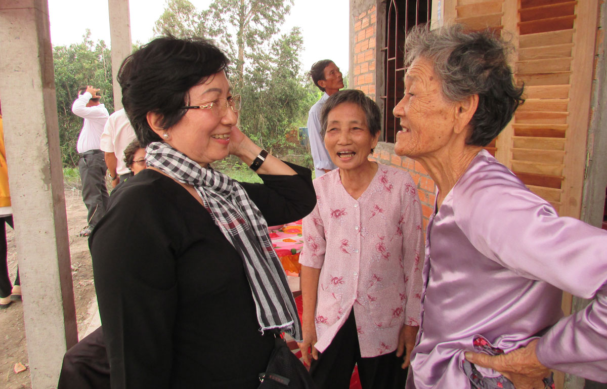 Bà Hồ Bạch Tuyết (bìa trái) trao nhà tình thương tại xã Bình Phong Thạnh, huyện Mộc Hóa
