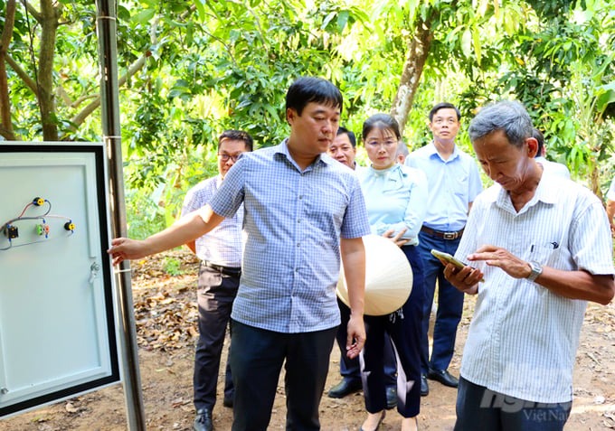 | Bí thư Tỉnh ủy Đồng Tháp Lê Quốc Phong (trái) khảo sát việc triển khai làng thông minh và tìm hiểu việc người dân thao tác các ứng dụng phần mềm công nghệ tại Tâm Quê hội quán (Ảnh: Lê Hoàng Vũ). |