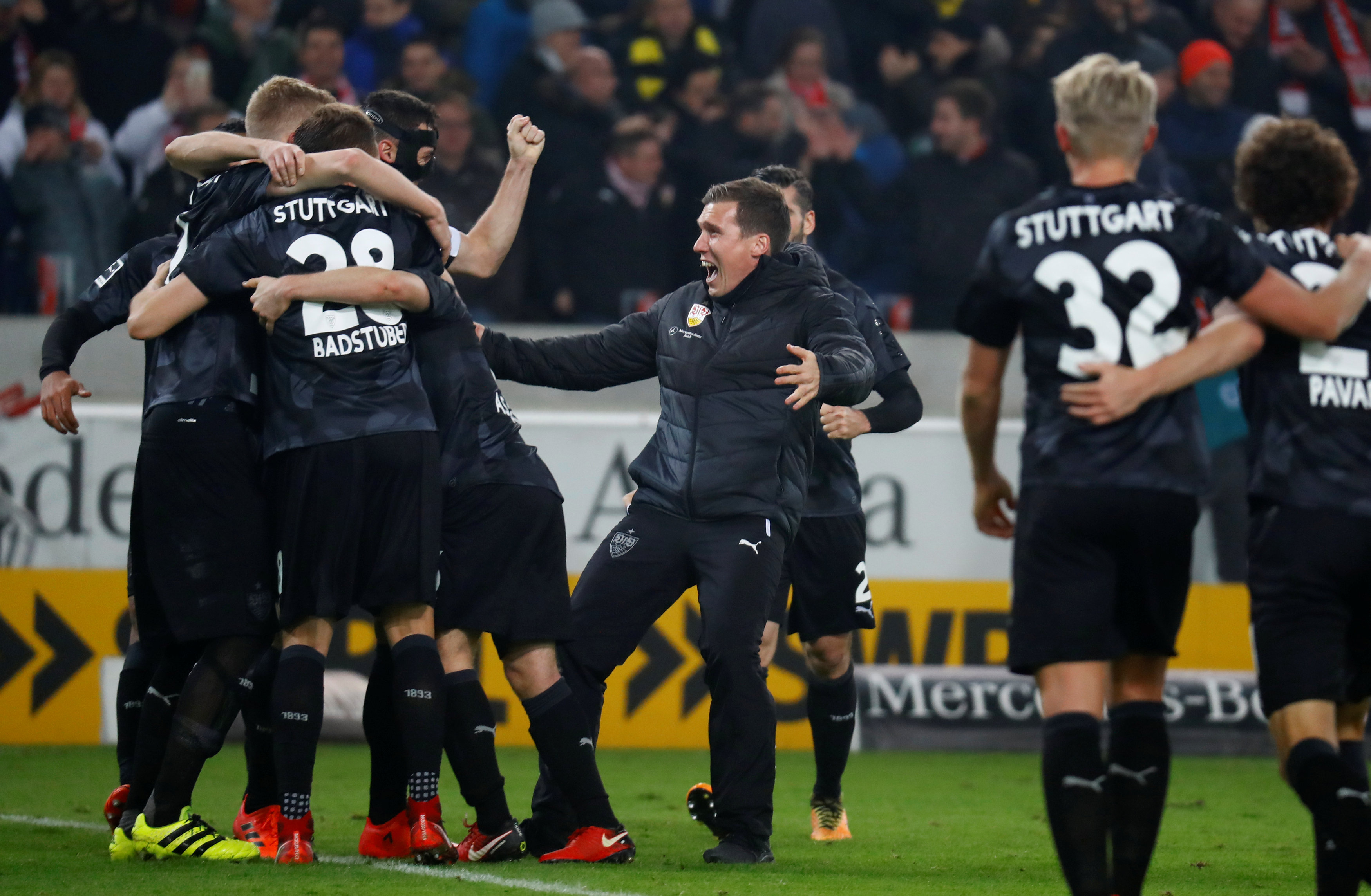 HLV Hannes Wolf (giữa) ăn mừng với các cầu thủ Stuttgart sau khi đá bại Dortmund. Ảnh: Reuters