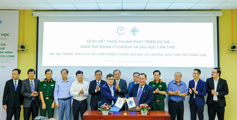 Đại diện Tập đoàn CT Group và Đại học Cần Thơ ký kết dự án Trung tâm UAV kết hợp robot nông nghiệp và Trường đào tạo phi công UAV, là nơi đào tạo nhân lực cũng như phát triển các sản phẩm về UAV phục vụ cho hoạt động sản xuất nông nghiệp thông minh. Ảnh: TUYẾT TRINH