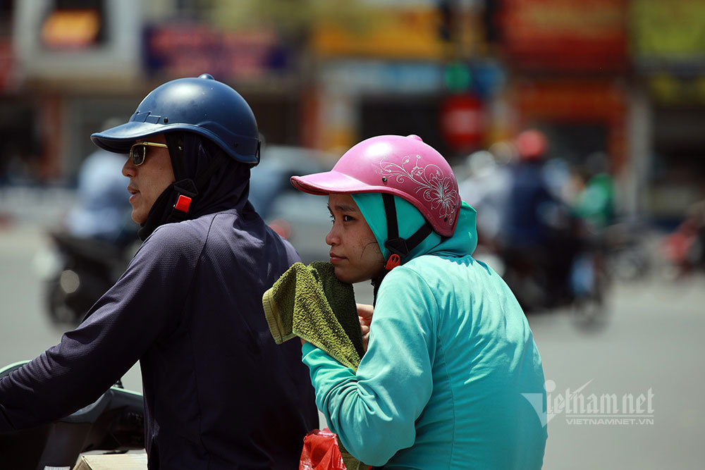 Nắng gắt ở Hà Nội, người đi đường mang theo cả khăn mặt ướt. Ảnh: Phạm Hải