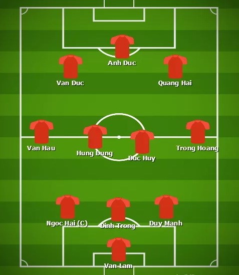 Ở hàng tiền vệ, 4 cái tên góp mặt sẽ là Văn Hậu, Hùng Dũng, Đức Huy và Trọng Hoàng. Trên hàng công, Anh Đức đá cao nhất, trong khi Văn Đức bên cánh trái còn cánh phải là Quang Hải.