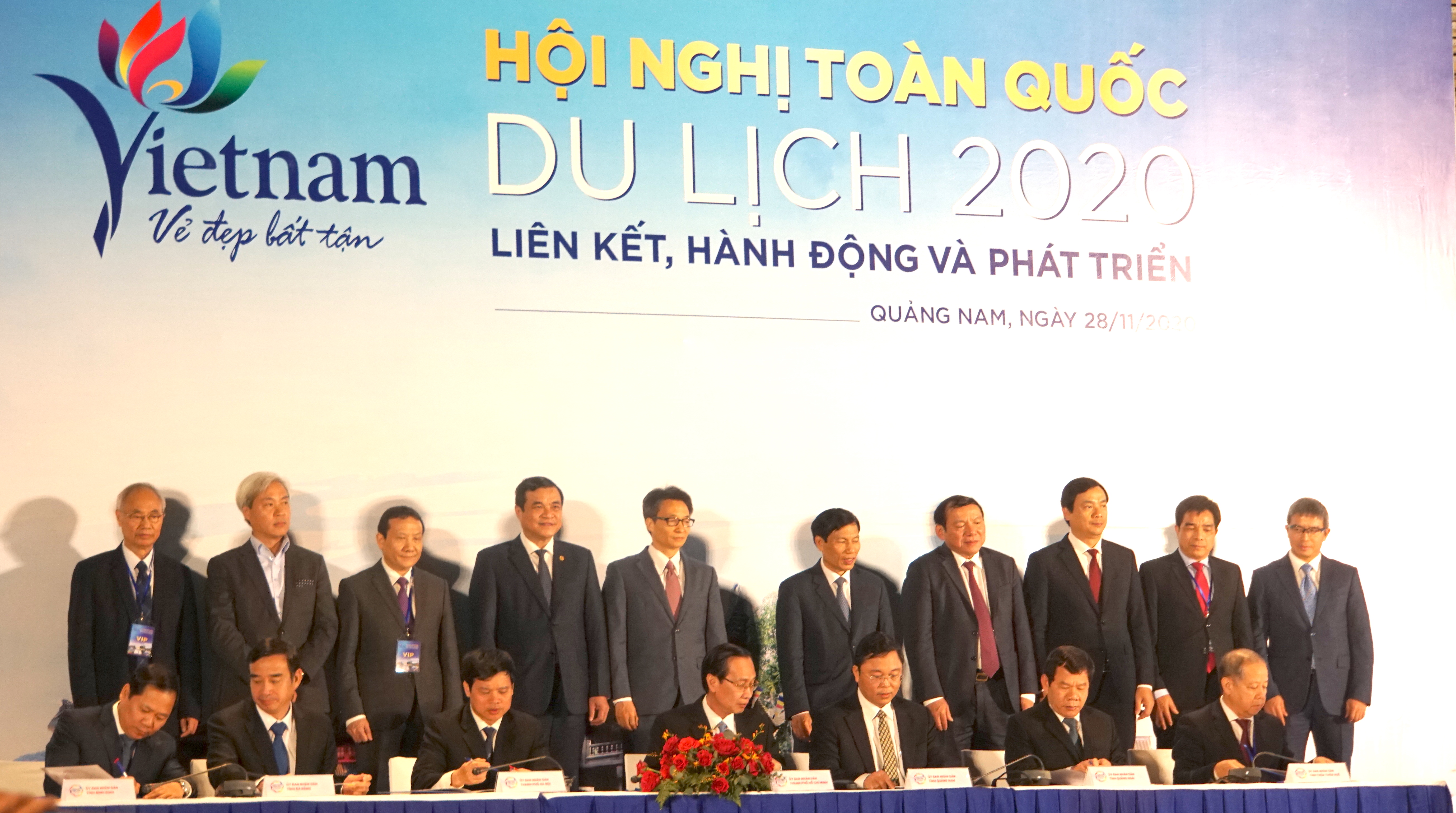 | Với sự chứng kiến của Phó Thủ tướng Chính phủ Vũ Đức Đam và lãnh đạo các bộ, ngành, địa phương, đại diện UBND TP Hồ Chí Minh, TP Hà Nội và 05 tỉnh, thành trọng điểm khu vực miền Trung ký kết liên kết phát triển du lịch giai đoạn 2020-2025 (ảnh: Đình Tăng). |