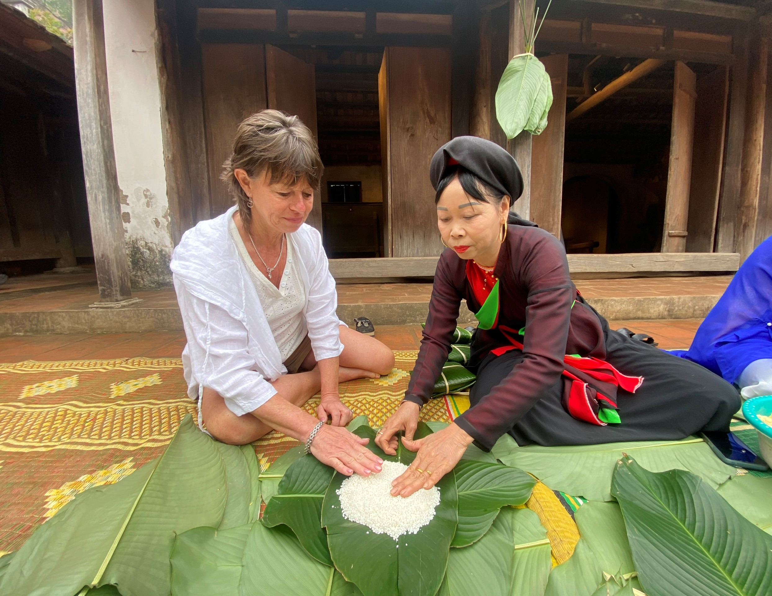 | Du khách quốc tế trải nghiệm gói bánh chưng trong dịp Tết cổ truyền tại Việt Nam. (Ảnh: PT) |