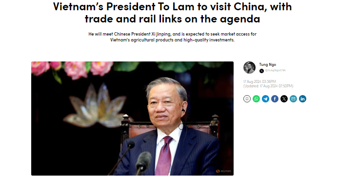 Nhấn mạnh tầm quan trọng chuyến thăm Trung Quốc của Tổng Bí thư, Chủ tịch nước Tô Lâm, kênh tin tức CNA của Singapore khẳng định, Trung Quốc là điểm công du nước ngoài đầu tiên của Tổng Bí thư, Chủ tịch nước Tô Lâm sau khi đảm nhiệm cương vị mới vào đầu tháng 8/2024.