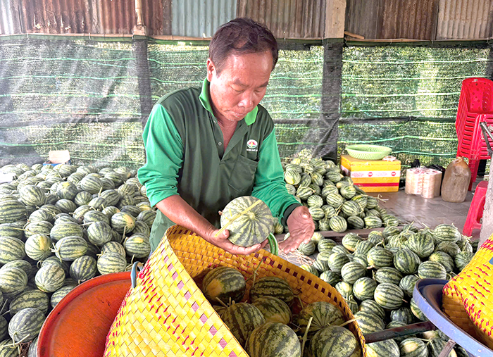 Ông Triệu Văn Út, ấp Mỏ Ó bên số dưa hấu trồng hữu cơ vừa mới thu hoạch.
