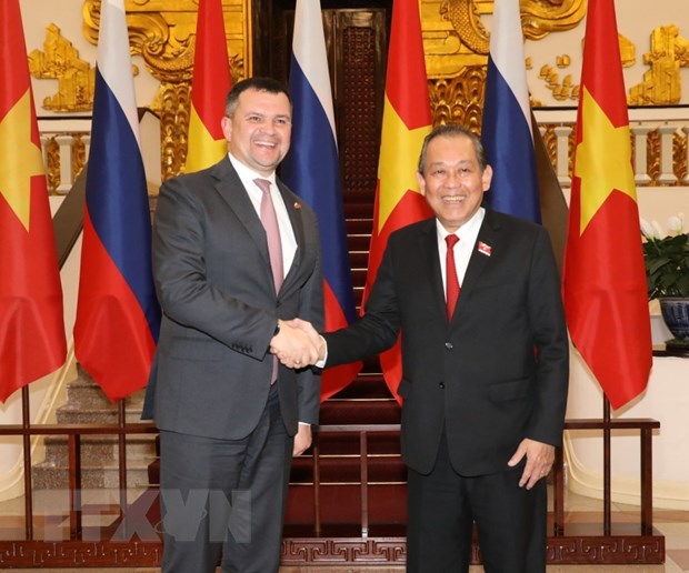Phó Thủ tướng Thường trực Chính phủ Trương Hòa Bình tiếp Phó Thủ tướng Chính phủ Liên bang Nga Maxim Akimov. (Ảnh: Văn Điệp/TTXVN)