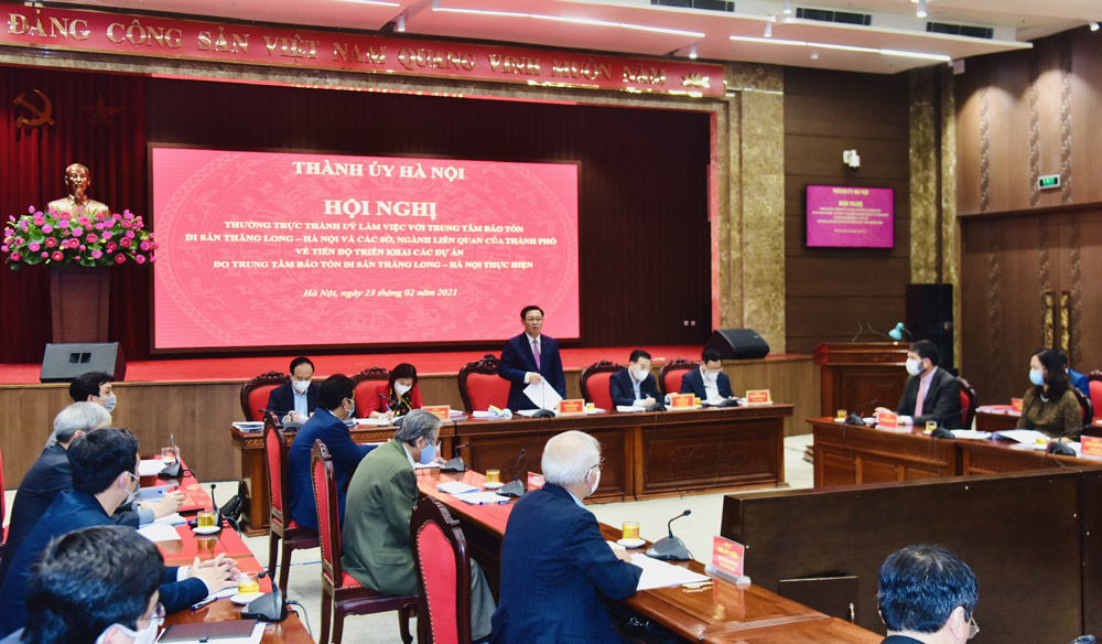 Chiều 23/2, Thường trực Thành ủy Hà Nội làm việc với Trung tâm bảo tồn Di sản Thăng Long – Hà Nội và các sở, ngành liên quan của Thành phố về việc quản lý, bảo tồn, tôn tạo và phát huy giá trị di sản và tiến độ triển khai các dự án do Trung tâm bảo tồn di sản Thăng Long – Hà Nội thực hiện.