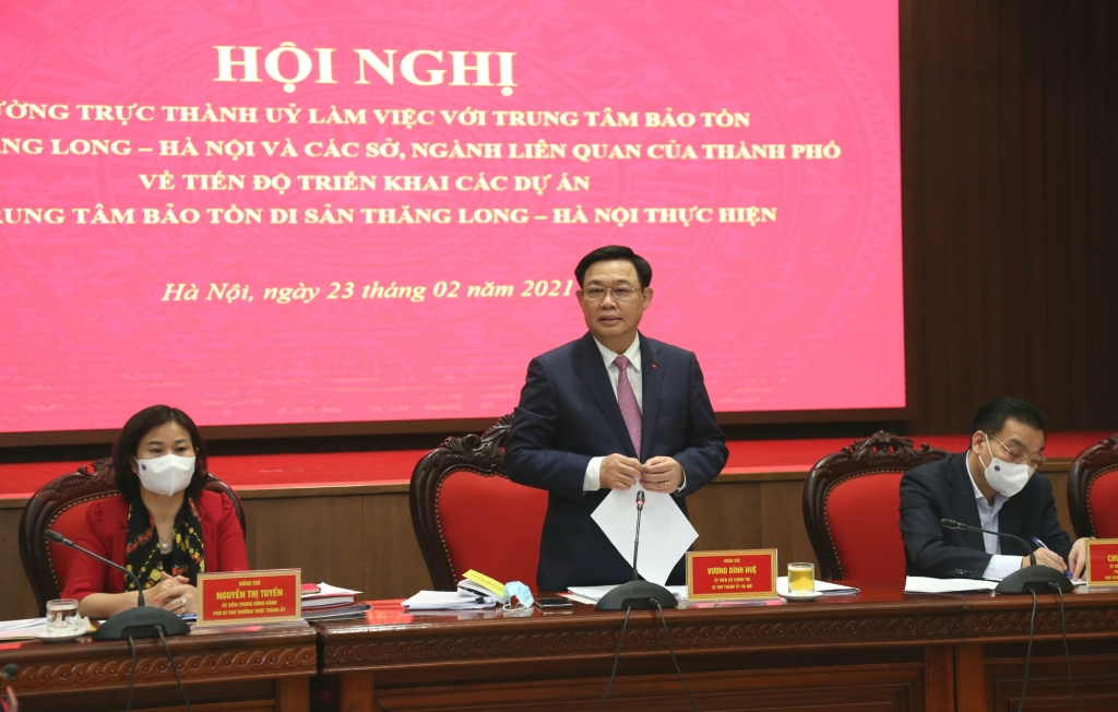 Nhấn mạnh một số yêu cầu, nhiệm vụ thời gian tới, Bí thư Vương Đình Huệ chỉ đạo các cấp, các ngành tiếp tục làm sâu sắc hơn nữa chủ trương, quan điểm lớn của Đảng, Nhà nước ta đối với việc bảo tồn, phát huy các di sản thế giới và di sản quốc gia; nhận thức rõ hơn những giá trị to lớn của Khu di tích Hoàng thành Thăng Long và Khu di tích Cổ Loa; từ đó quyết tâm, trách nhiệm, không chỉ thực hiện bằng năng lực, trình độ, mà bằng cả tâm huyết; phân tích, làm rõ những kết quả đạt được, những tồn tại, hạn chế cần tháo gỡ...