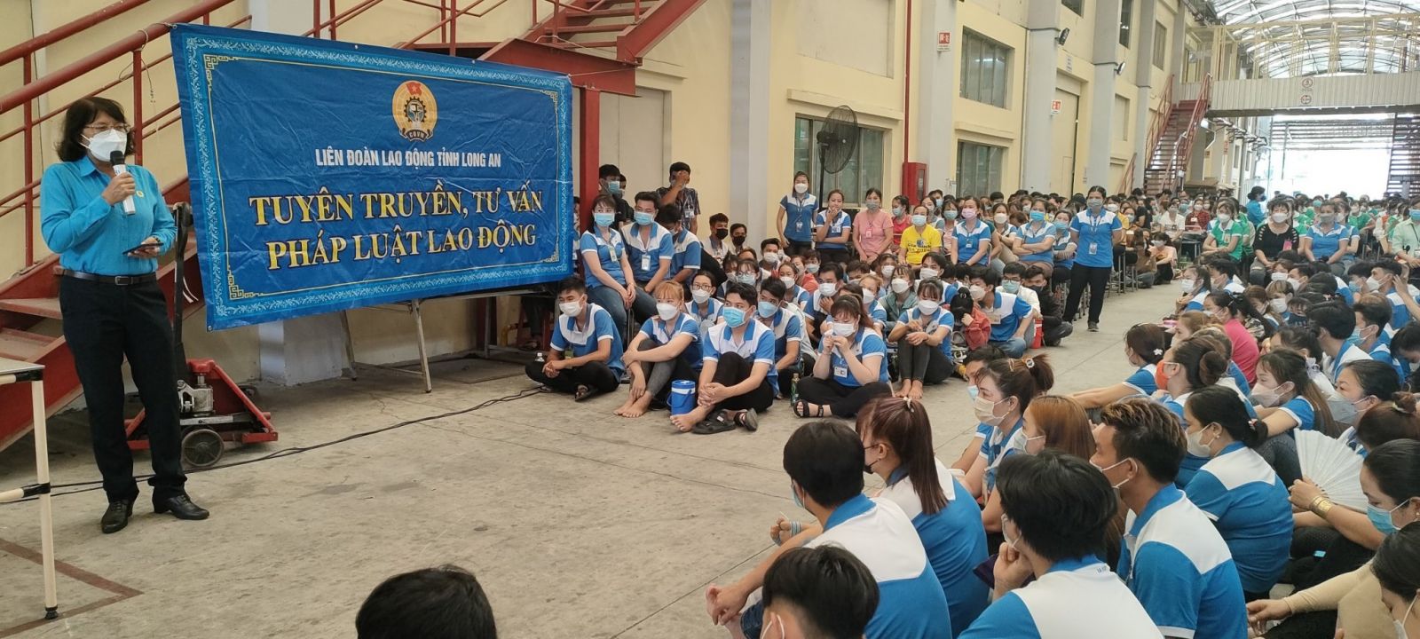 Phó Chủ tịch Liên đoàn Lao động tỉnh - Lệ Thị Thu Cúc tư vấn pháp luật lao động cho công nhân Công ty Jia Hsin, huyện Cần Đước