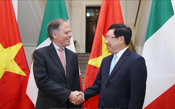 Hai bên bày tỏ vui mừng trước những bước phát triển tích cực và sôi động trên mọi lĩnh vực của quan hệ đối tác chiến lược Việt Nam – I-ta-li-a trong thời gian qua, đặc biệt trong bối cảnh hai nước vừa kỷ niệm 45 năm ngày thiết lập quan hệ ngoại giao (23/3/1973 – 23/3/2018) và 5 năm thiết lập quan hệ đối tác chiến lược (2013 -2018). Đồng thời, khẳng định sẽ tiếp tục tăng cường trao đổi đoàn và tiếp xúc các cấp, nhất là cấp cao, duy trì và triển khai hiệu quả các cơ chế Đối thoại chiến lược cấp Thứ trưởng Ngoại giao, Đối thoại Chính sách quốc phòng cấp Thứ trưởng và Ủy ban hỗn hợp về hợp tác kinh tế Việt Nam –I-ta-li-a. Hai bên cũng nhất trí sẽ triển khai sớm ký Kế hoạch hành động triển khai quan hệ Đối tác chiến lược Việt Nam – I-ta-li-a giai đoạn 2019 – 2020 trong thời gian tới.