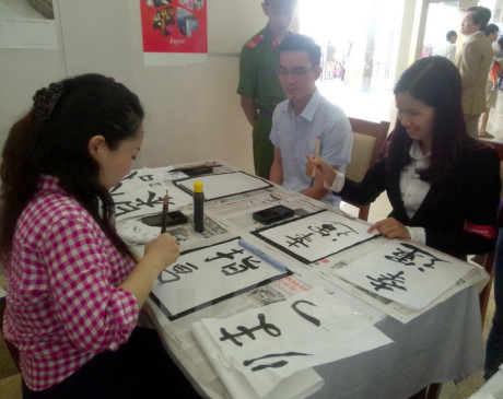 Các bạn trẻ Việt Nam trải nghiệm viết thư pháp Nhật Bản.