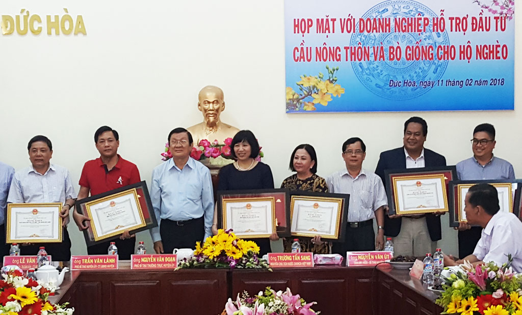 Nguyên Chủ tịch nước – Trương Tấn Sang, lãnh đạo huyện Đức Hòa chụp ảnh lưu niệm với các mạnh thường quân được nhận bằng khen của UBND tỉnh
