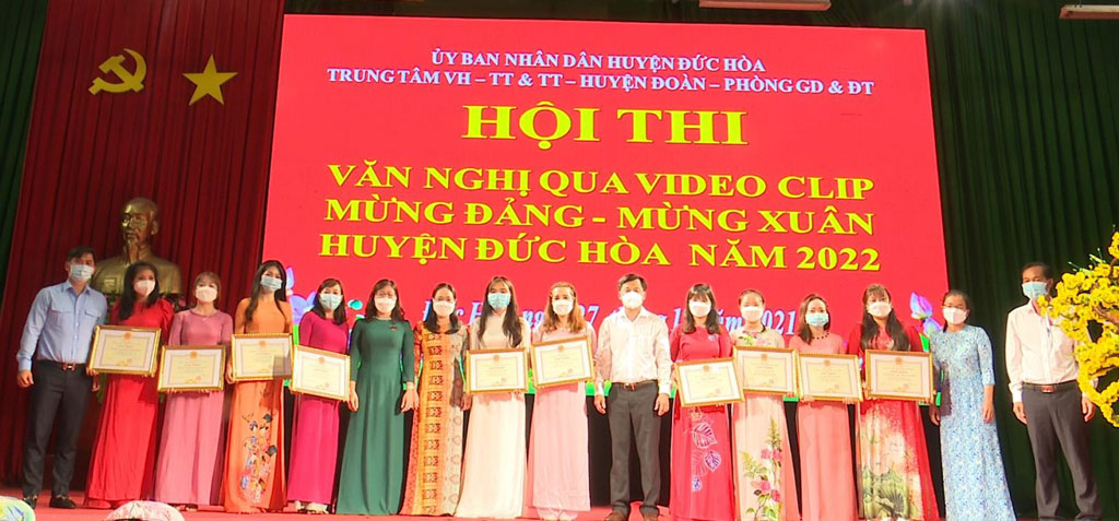 Chủ tịch UBND huyện Đức Hòa - Lê Trường Chinh (giữa) trao giấy khen cho các đội thi có thành tích cao