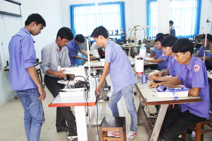 Học sinh được giáo viên hướng dẫn thực hành máy may (Ảnh: Ngọc Thạch)