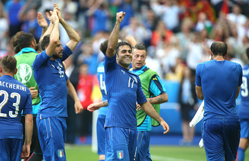 Italia: Buffon; Barzagli, Bonucci, Chiellini; Florenzi, Sturaro, Parolo, Giaccherini, De Sciglio; Pellè, Éder.