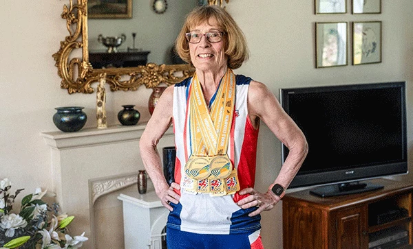Bà Sarah Roberts đeo một vài trong số rất nhiều huy chương giành được trong các giải chạy. Ảnh: Sean Smith