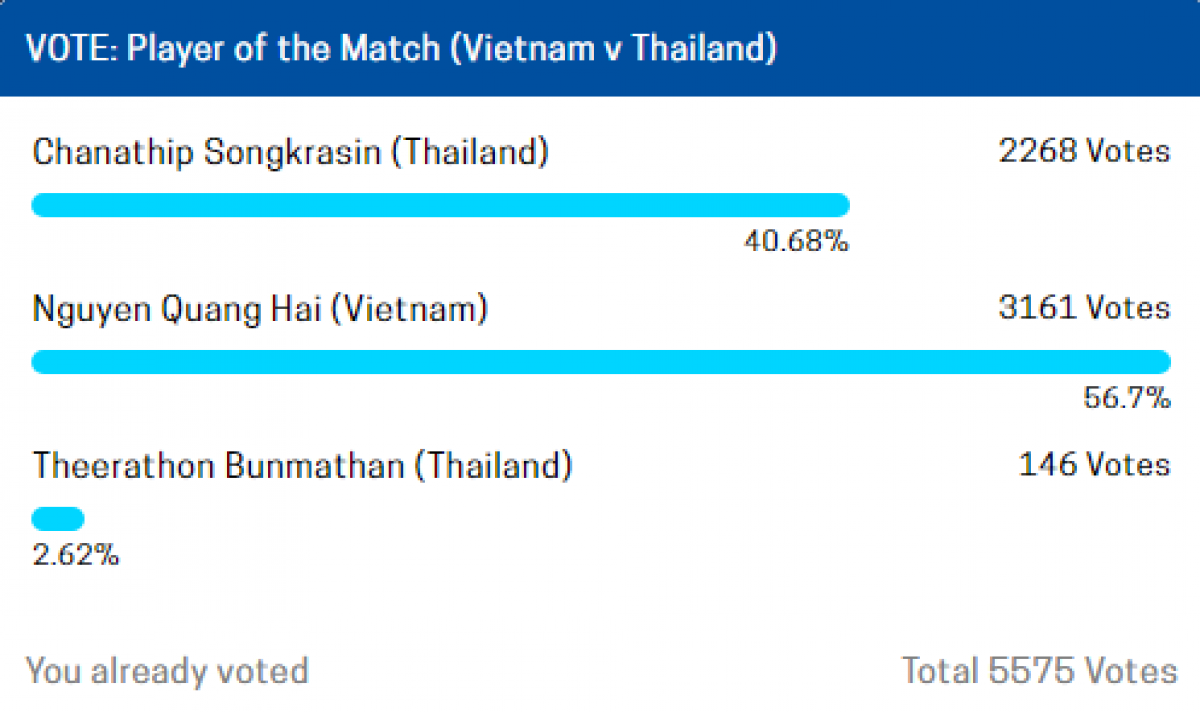 Do đó, ba cầu thủ này được Ban tổ chức lựa chọn để các cổ động viên bầu Cầu thủ hay nhất trận đấu bán kết lượt đi giữa ĐT Việt Nam với ĐT Thái Lan. Ngay sau khi cuộc bầu chọn được mở ra, Quang Hải đã chiếm lợi thế, bỏ xa hai người đồng nghiệp bên phía Thái Lan.