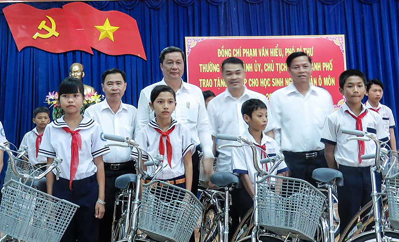 Ông Phạm Văn Hiểu, Phó Bí thư Thường trực Thành ủy Cần Thơ, Chủ tịch HĐND TP Cần Thơ cùng lãnh đạo quận Ô Môn trao xe đạp cho học sinh vượt khó, học giỏi. Ảnh: NG.NGÂN