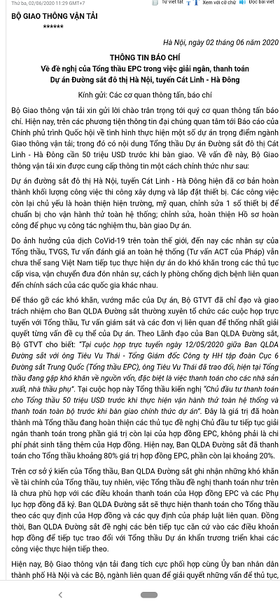 Ngay sau khi một số cơ quan báo chí, truyền thông thông tin về Báo cáo của Chính phủ trình Quốc hội về tình hình thực hiện một số dự án trọng điểm ngành giao thông vận tải đã tạo ra sự quan tâm lớn của nhân dân; trong đó có nội dung Tổng thầu Dự án Đường sắt đô thị Cát Linh - Hà Đông cần 50 triệu USD trước khi bàn giao. Ngày 2/6, Bộ Giao thông Vận tải (GTVT) đã có văn bản thông tin chính thức về vấn đề này.