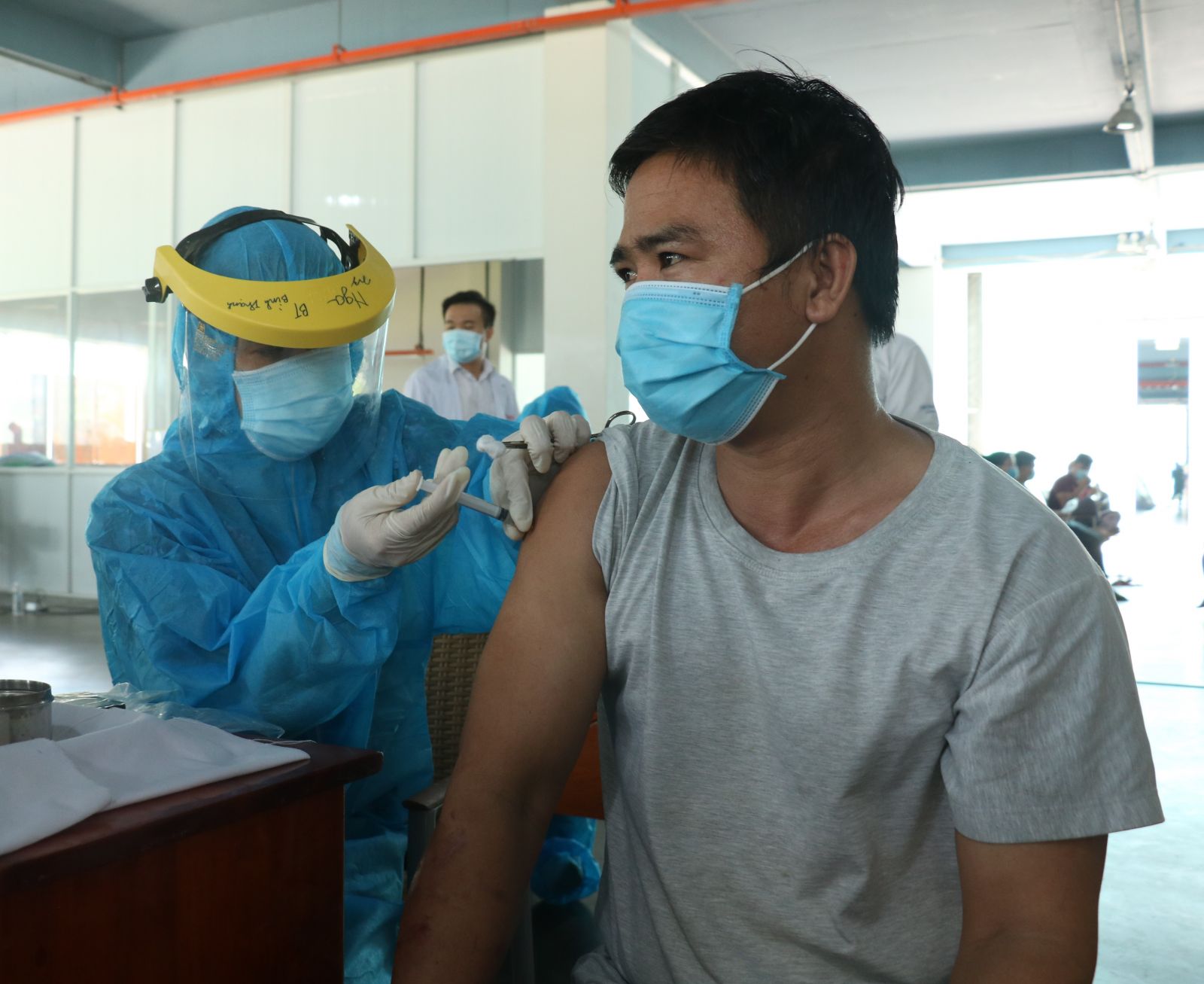 Tiêm vắc-xin phòng Covid-19 cho công nhân của các doanh nghiệp thực hiện phương án “3 tại chỗ” (Ảnh chụp tại Công ty TNHH SX-TM Tân Thành Hòa Long An)