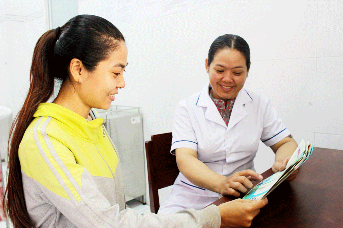 Cán bộ dân số phường An Thới, quận Bình Thủy, tư vấn lợi ích các biện pháp KHHGĐ cho chị em.