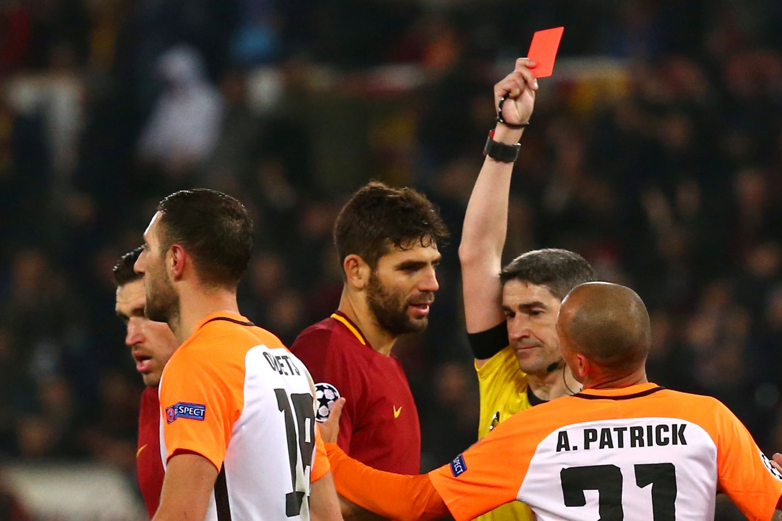 Sau bàn thắng, AS Roma tiếp tục chơi tốt và gây nhiều khó khăn cho AS Roma qua những tình huống phản công chớp nhoáng. Và trong một tình huống phản công ở phút 79, Dzeko một lần nữa phá bẫy việt vị thành công thoát xuống rất nhanh, buộc hậu vệ Ivan Ordec phải phạm lỗi. Trọng tài ngay lập tức rút thẻ đỏ truất quyền thi đấu Ordec, qua đó dập tắt luôn những hi vọng lật ngược tình thế của Shakhtar Donetsk.