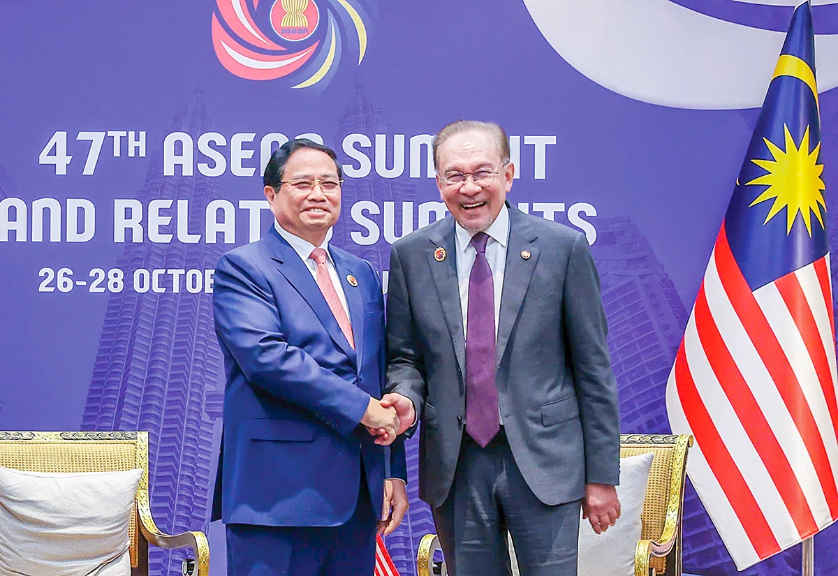 Thủ tướng Phạm Minh Chính (bên trái) gặp Thủ tướng Malaysia Anwar Ibrahim, Chủ tịch ASEAN 2025.