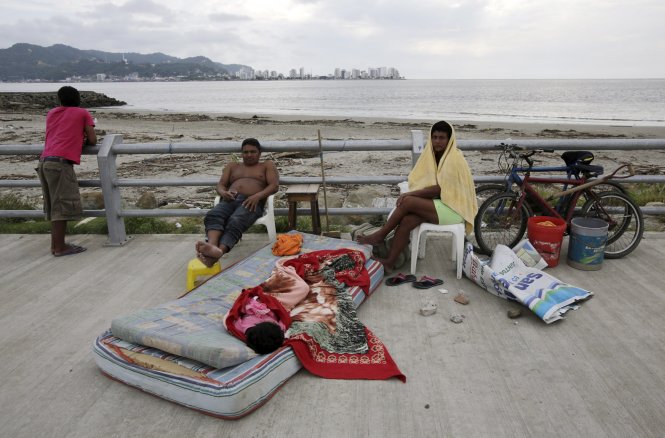 Một gia đình Ecuador đang phải ở tạm ngoài trời sau thảm họa động đất - Ảnh: Reuters